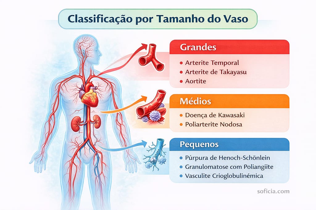 A classificação das vasculites é complexa e leva em conta principalmente o tamanho dos vasos sanguíneos afetados (grandes, médios ou pequenos), além das características clínicas e imunológicas. Conhecer o tipo é fundamental para definir o tratamento.